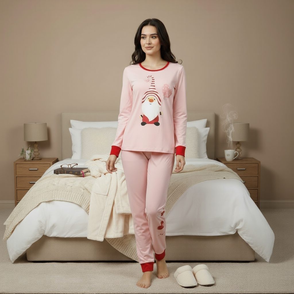 Mehka pižama iz bombaža z elastanom navduši z igrivim potiskom in udobnimi patenti. Posebno noto ji doda rdeča obroba okoli vratnega izreza – droben detajl z veliko šarma.