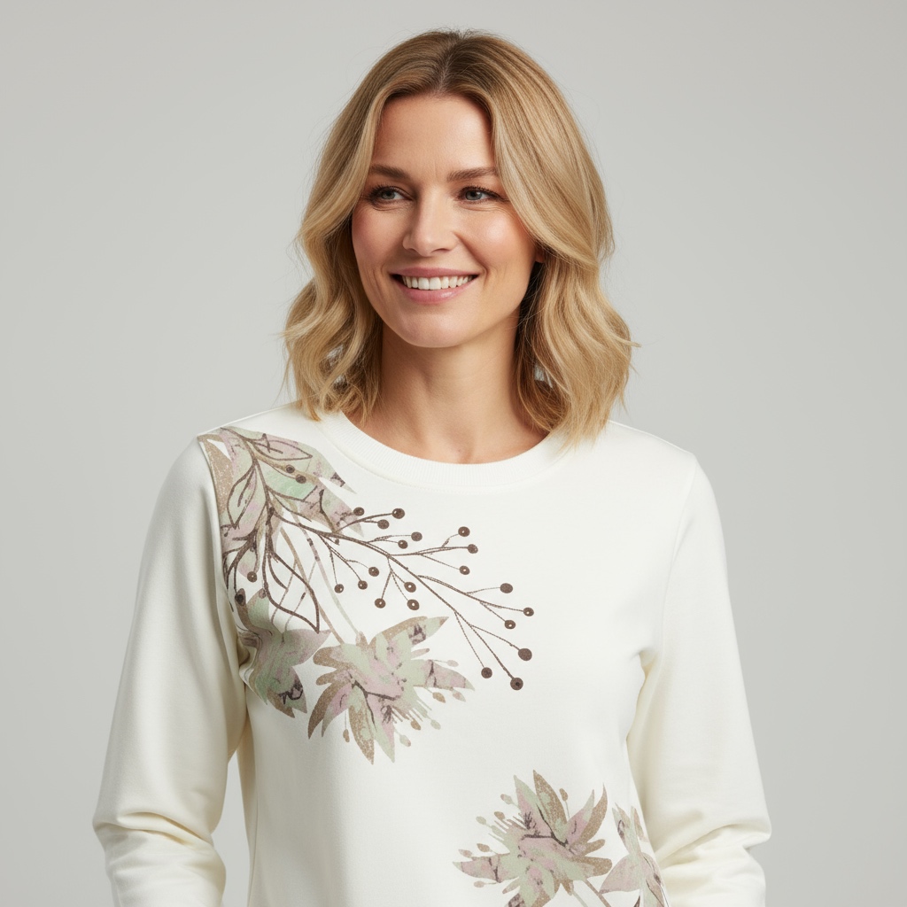 Pulover s potiskom in patenti na rokavih. Krasijo ga “biserčki” na potisku.