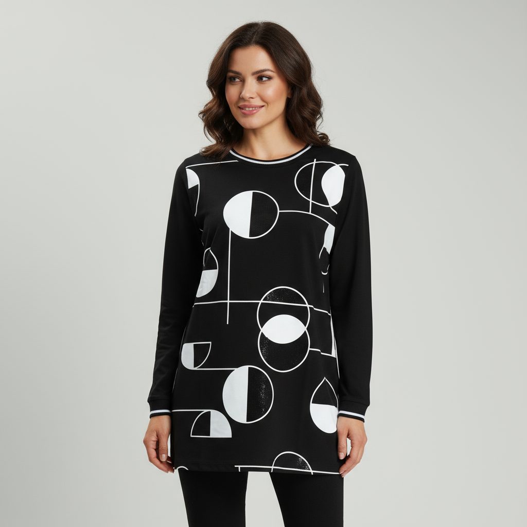 Sproščena tunika za hladnejše dni, z dolgimi rokavi, bleščicami na potisku in stilsko zaključnimi patenti.
